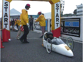 9/9 地元での最後の練習のつもりがフェンスに激突。前輪を取り付けてあった3mm厚のアルミにステンレスを巻いたパイプが引きちぎれ、アルミ・FRP混成モノコックのフロントセクションが大破、再生不能と思われました。91年参加以来放置してあった2号車(今回のは3号車)を整備して使おうと3号車のエンジンパーツを移植し始めましたがドライバーの体格が合わず、しかも運転操作がまったく違うので無理があると判断。3号車を再生できなければ棄権もやむをえないと覚悟を決める。重量増にも目をつぶりアルミにFRPを貼り付けテストもせずに組み付ける